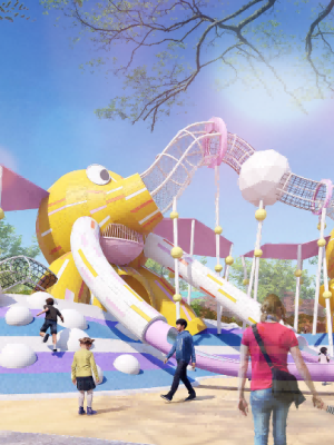We've designed the equipment by utilizing the elephant's ears as a cooling feature, its tusks as dual slides, and its trunk as a climbing tower.