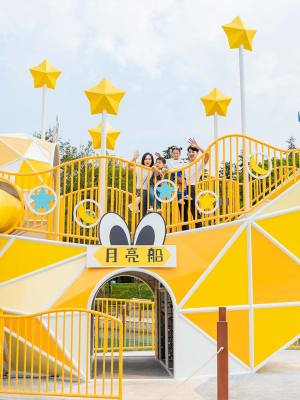 The Moon Boat incorporates lunar and stellar themes, with its main body colored a vibrant yellow.