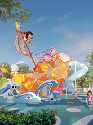 Within the octopus-themed boat, we've incorporated the excitement of ascending to the boat's summit via climbing nets and then descending from the peak on a thrilling rotating slide.