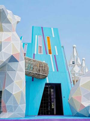 The Polar Bear Play Tower features a Glacier Tower as its centerpiece, adorned with polar bear figures and a color scheme of blue and white.