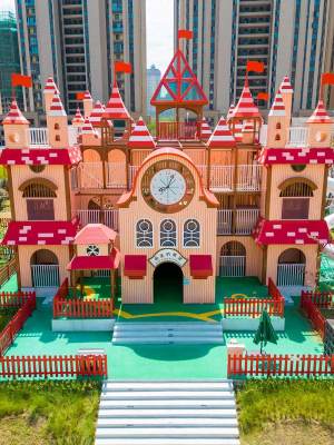 The castle, a key park feature and children's adventure game, features a maze-like design with over a dozen elevated activity areas including slides, trampolines, swings, and climbing facilities.